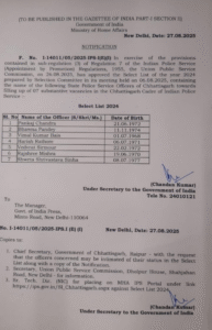रायपुर। छत्तीसगढ़ राज्य पुलिस सेवा के 7 आफिसर कों आईपीएस अवार्ड हो गया है। भारत सरकार ने नोटिफिकेशन जारी कर दिया है। 06 अगस्त को दिल्ली में डीपीसी हुई थी। यानि छ्ग में 7 आई पीएस अफसर अब और बढ़ गये हैं। आईपी एस बननेवालों में पंकज चंद्रा भावना पांडे,विमलकुमार बैस, हरीश राठौर वेदव्रत सिर मौर, राजश्री मिश्रा, श्वेता श्रीवास्तव सिन्हा शामिल हैं।यहां यह बताना जरुरी है कि भावना के पति विजय पांडे आईपीएस, जांज गीर चांपा के एस पी हैं तो श्वेता के पति तारण प्रकाश सिन्हा आईएएस, विकास आयुक्त हैं।