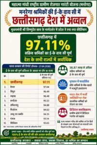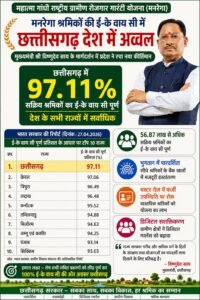 रायपुर। महात्मा गांधी राष्ट्रीय ग्रामीण रोजगार गारंटी योजना (मनरेगा) के अंतर्गत श्रमिकों के ई-के वाय सी कार्य में छत्तीसगढ़ ने पूरे देश में प्रथम स्थान प्राप्त कर उल्लेखनीय उपलब्धि हासिल की है। भारत सरकार द्वारा जारी ताजा रिपोर्ट के अनुसार प्रदेश में 97.11 प्रतिशत सक्रिय श्रमिकों का ई-के वाय सी पूर्ण कर लिया गया है, जो राष्ट्रीय स्तर पर सर्वाधिक है। खास बात यह है कि छत्तीसगढ़ ने केरलम, त्रिपुरा, मिजोरम जैसे छोटे राज्यों तथा कर्नाटक, तमिलनाडु जैसे बड़े राज्यों को भी पछाड़कर यह उपलब्धि हासिल की है।